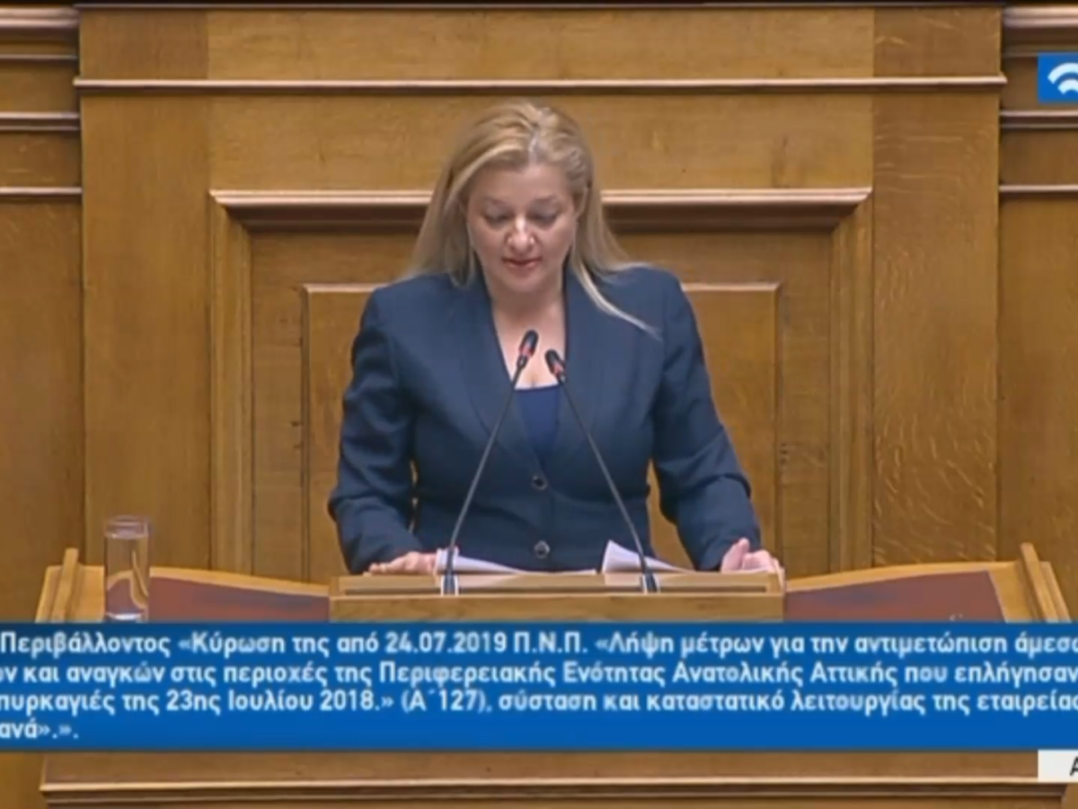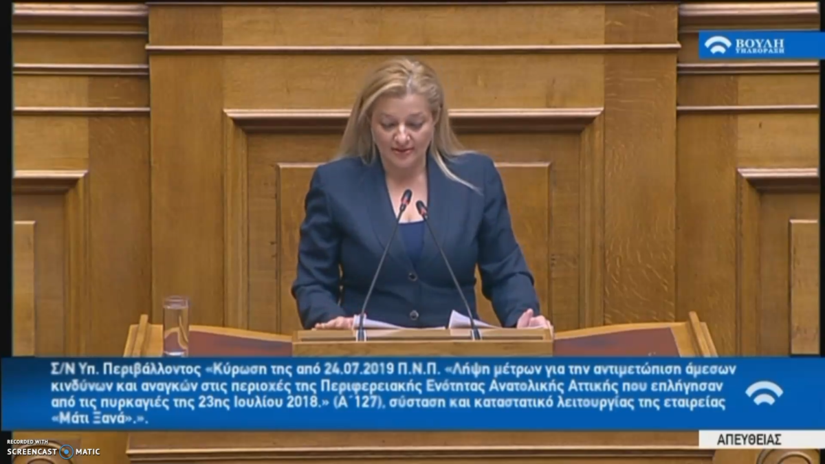 Η Δρ. Διονυσία – Θεοδώρα Αυγερινοπούλου, Βουλευτής Ν. Ηλείας και Πρόεδρος της Επιτροπής Περιβάλλοντος της Βουλής, πραγματοποίησε παρέμβαση στη Συνεδρίαση της Ολομέλειας για το Μάτι, εξαίροντας την πρωτοβουλία της Κυβέρνησης να συστήσει την εταιρεία «Μάτι Ξανά» που θα επιμελείται έργα για την ασφάλεια των κατοίκων και την πρωτοβουλία του Πρωθυπουργού της χώρας για απομάκρυνση της καύσιμης ύλης στο Μάτι. Κυρίως, όμως, άδραξε την ευκαιρία να θέσει το θέμα των λιμναζόντων κεφαλαίων στον Ειδικό Λογαριασμό της Τράπεζας της Ελλάδας για την αποκατάσταση της Πελοποννήσου και ειδικότερα της Ηλείας από τις πυρκαγιές του 2007. Η κα Αυγερινοπούλου ζήτησε: