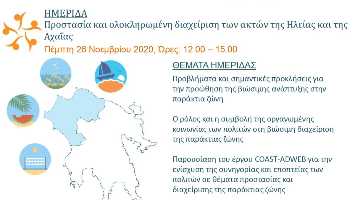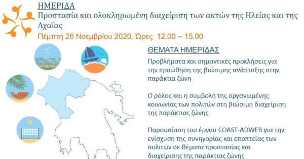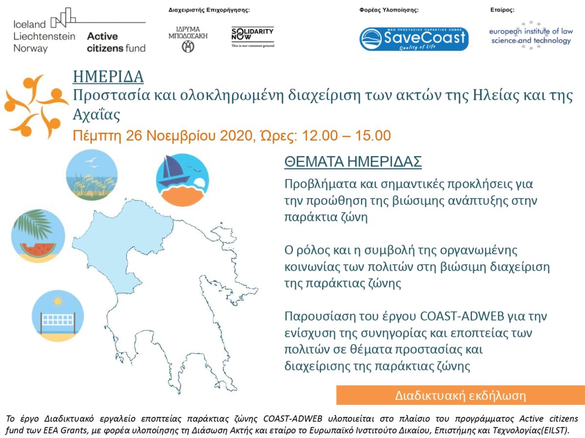 Στο πλαίσιο του έργου CoastAdWeb, η Δρ. Διονυσία – Θεοδώρα Αυγερινοπούλου, Εκτελεστική Διευθύντρια του Ευρωπαϊκού Ινστιτούτου Δικαίου, Επιστήμης και Τεχνολογίας (EILST) και Βουλευτής Ν. Ηλείας, Ν.Δ., λαμβάνει την τιμή να σας προσκαλέσει να παρακολουθήσετε τη διαδικτυακή ημερίδα για την προστασία και την ολοκληρωμένη διαχείριση των ακτών της Ηλείας και της Αχαΐας. Η ημερίδα θα διεξαχθεί την Πέμπτη, 26 Νοεμβρίου 2020, και τις ώρες 12:00-15:00 με τη συμμετοχή διακεκριμένων εισηγητών από το Υπουργείο Περιβάλλοντος και Ενέργειας, την Περιφέρεια Δυτικής Ελλάδος, αλλά και την Τοπική Αυτοδιοίκηση.
