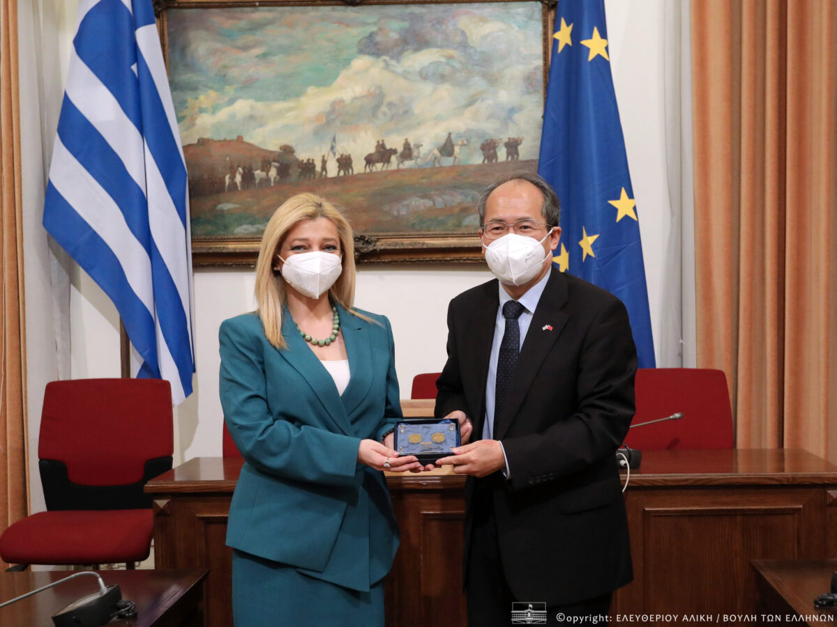 Τέλος, η Πρόεδρος, εκ μέρους της Βουλής των Ελλήνων, προσέφερε ως δώρο στον Πρέσβη μια κασετίνα 2 ορειχάλκινων νομισμάτων με τη μορφή του Ελ. Βενιζέλου και του Θωρηκτού Αβέρωφ αντίστοιχα, που εκδόθηκαν με την ευκαιρία του εορτασμού από την Βουλή των Ελλήνων των 90 χρόνων από τους Βαλκανικούς Πολέμους, ενώ ο Πρέσβης δώρισε στην Πρόεδρο αναμνηστικά από τους Χειμερινούς Ολυμπιακούς Αγώνες 2022 στο Πεκίνο.