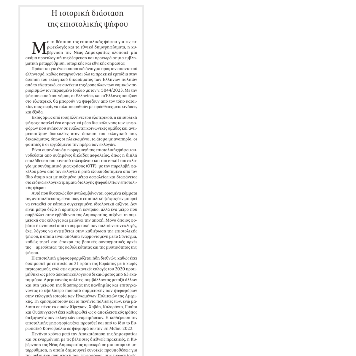 Πενήντα χρόνια μετά την Αποκατάσταση της Δημοκρατίας και σε εναρμόνιση με τις βέλτιστες διεθνείς πρακτικές, η Κυβέρνηση της Νέας Δημοκρατίας προχωρά σε μια ιστορική μεταρρύθμιση, η οποία δημιουργεί ευνοϊκές προϋποθέσεις για την αυξημένη συμμετοχή των ψηφοφόρων στις ευρωεκλογές, βαθαίνει την έννοια της Δημοκρατίας, μειώνει την αποχή και αναθερμαίνει το ενδιαφέρον των πολιτών για την έννοια της Πολιτικής.