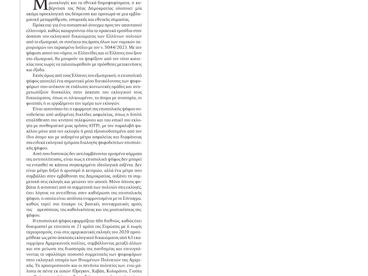 Αυτό που δυστυχώς δεν αντιλαμβάνονται ορισμένα κόμματα της αντιπολίτευσης, είναι πως η επιστολική ψήφος δεν μπορεί να ενταχθεί σε κάποια συγκεκριμένη ιδεολογική ατζέντα. Δεν είναι μέτρο δεξιό ή αριστερό ή κεντρώο, αλλά ένα μέτρο που συμβάλλει στην εμβάθυνση της Δημοκρατίας, αυξάνει τη συμμετοχή στις εκλογές και μειώνει την αποχή.