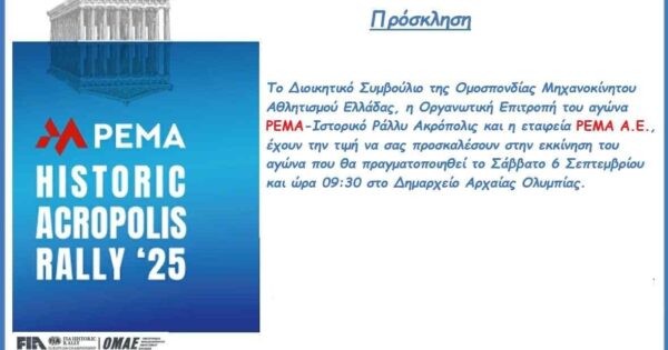 Το PEMA Historic Acropolis Rally 2025, στο πλαίσιο των αγώνων Regularity που αναβιώνουν το παρελθόν, περιλαμβάνει, εκτός από την Αρχαία Ολυμπία όπου θα διανυκτερεύσουν οι συμμετέχοντες το βράδυ της Παρασκευής, τη διέλευση από ιστορικά μνημεία όπως η Αρχαία Κόρινθος, η Ναύπακτος και οι Δελφοί, φέρνοντας στις μνήμες εικόνες από τις πρώτες διοργανώσεις του Ράλλυ Ακρόπολις. Την Παρασκευή, στις 13:00, κάτω από τη σκιά του Ιερού Βράχου της Ακρόπολης, θα δοθεί η πανηγυρική εκκίνηση του αγώνα με τους συμμετέχοντες να κατευθύνονται μέσω Αττικής Οδού στην Κόρινθο και εν συνεχεία Κλειτορίας, Κοντοβάζαινας, Γέφυρας του Ερυμάνθου, Λούβρου, θα καταλήξουν στην Αρχαία Ολυμπία – μια πόλη που κουβαλά στις ρίζες της την παγκόσμια ιστορία του αθλητισμού και του πολιτισμού.