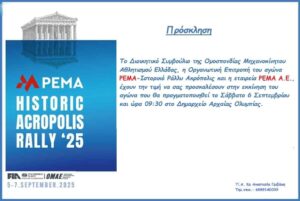 Το PEMA Historic Acropolis Rally 2025, στο πλαίσιο των αγώνων Regularity που αναβιώνουν το παρελθόν, περιλαμβάνει, εκτός από την Αρχαία Ολυμπία όπου θα διανυκτερεύσουν οι συμμετέχοντες το βράδυ της Παρασκευής, τη διέλευση από ιστορικά μνημεία όπως η Αρχαία Κόρινθος, η Ναύπακτος και οι Δελφοί, φέρνοντας στις μνήμες εικόνες από τις πρώτες διοργανώσεις του Ράλλυ Ακρόπολις. Την Παρασκευή, στις 13:00, κάτω από τη σκιά του Ιερού Βράχου της Ακρόπολης, θα δοθεί η πανηγυρική εκκίνηση του αγώνα με τους συμμετέχοντες να κατευθύνονται μέσω Αττικής Οδού στην Κόρινθο και εν συνεχεία Κλειτορίας, Κοντοβάζαινας, Γέφυρας του Ερυμάνθου, Λούβρου, θα καταλήξουν στην Αρχαία Ολυμπία – μια πόλη που κουβαλά στις ρίζες της την παγκόσμια ιστορία του αθλητισμού και του πολιτισμού.